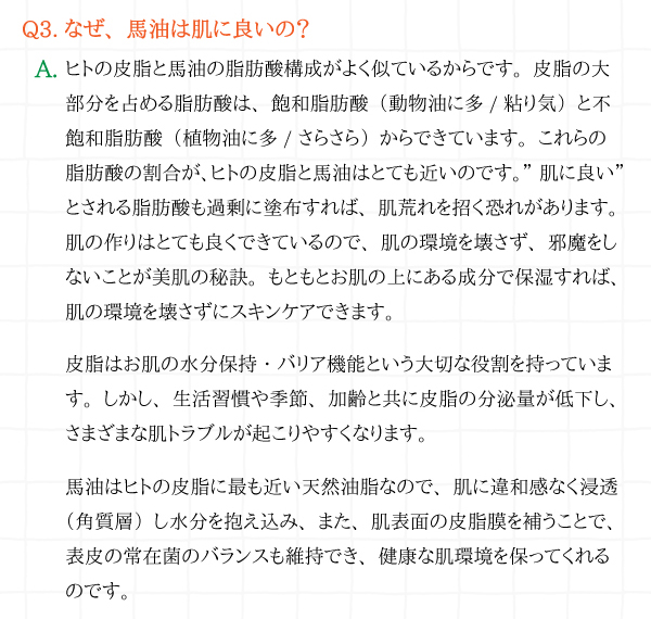 お肌に不要な臭いやべたつきの元となる不純物を取り除いた、 国産馬油100%のクリームです。 染み込むように馴染み、やわらかくしっとりしたお肌に導きます。 特に乾燥の気になる部分には化粧水とクリームを 何度か重ね付けすることをおすすめします。