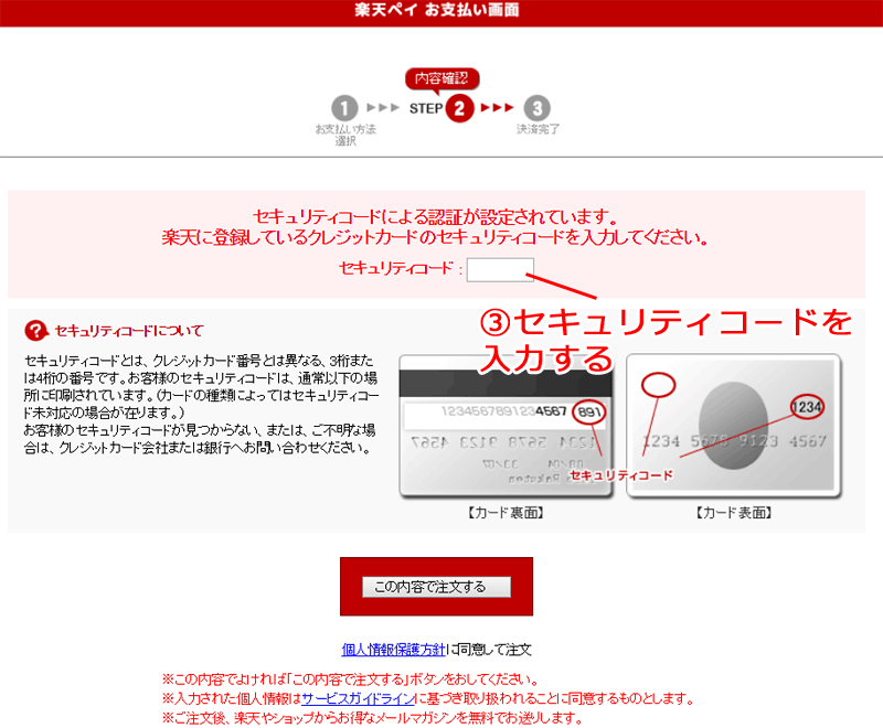 が表示されますのでご注文内容、ご利用するクレジットカード、楽天ポイントの利用数、ご要望がございます場合は備考欄(お支払い画面下部にございます)をご記入の上、画面上部のセキュリティコードを入力してください。