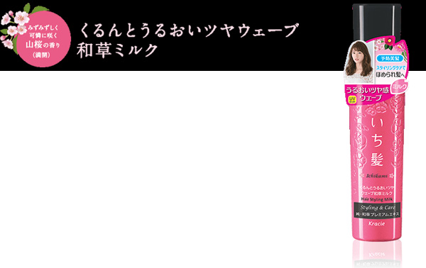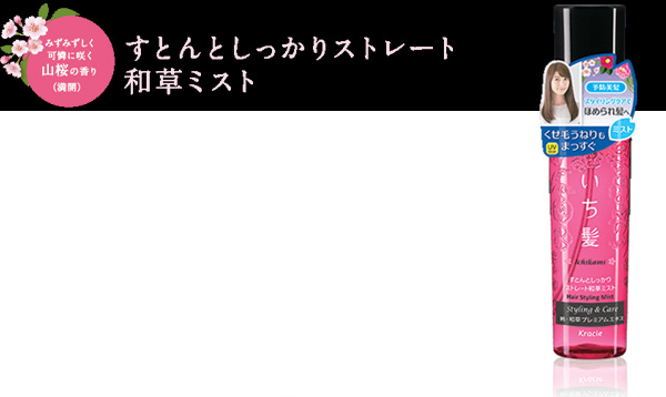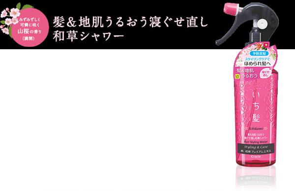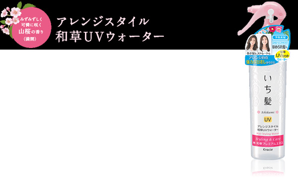 強力な日差しから髪を守り、 巻き髪もストレートもナチュラルにキープ。 <アレンジスタイルキープ処方> 髪1本1本のうるおいコーティングで、巻き髪、ストレートをキープ。 □高配合*UVカット成分配合 (メトキシケイヒ酸エチルヘキシル、t-ブチルメトキシジベンゾイルメタン) □ドライヤーの熱から髪を守るヒートプロテクト □湿気コントロール *いち髪ストレート和草ミスト比 ご購入はこちら