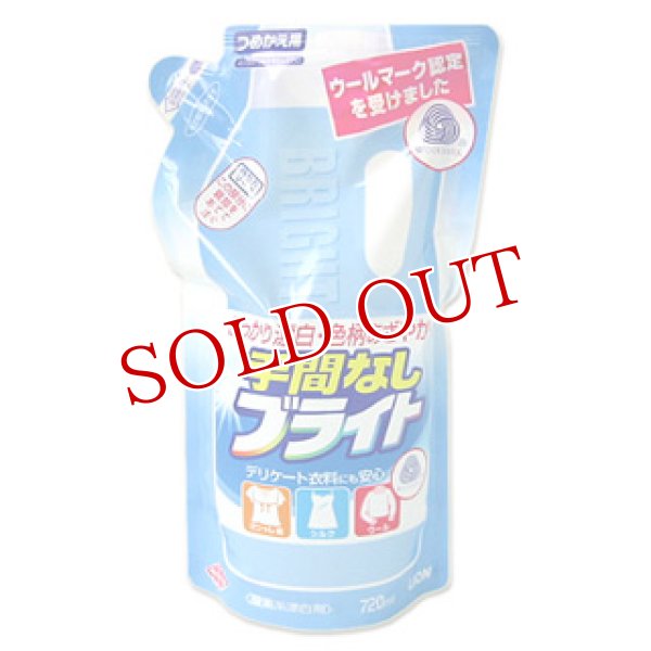 色柄・ウール・シルクにも安心な酸素系漂白剤 ■ 毎日の洗濯に手軽に使えて、シミ・黄ばみをしっかり漂白します。独自の漂白成分がシミ・黄ばみをすばやく、スッキリ落とします。 ■ デリケート衣料にも安心定期的な使用でおしゃれ着・シルク・ウールなどのデリケート衣料にも安心して使えます。2006年11月ウールマーク品質管理本部のあるイギリスにおいてテストされ、"ウォッシャブルウールマーク衣類についたシミ・汚れを やさしく、しかもきれいに落とす製品"として、ウールマークの認定を受けました。(D4174)※衣料用漂白剤では国内唯一。 ■ 黄ばみを予防黄ばみ予防成分が、保管後の衣類の黄ばみを防ぎます。 ■ 除菌・除臭効果もあります。 ■ 必ずご使用前に表示をお読みください。 ■ 「手間なしブライト 1000ml」のボトルにつめかえてください。商品名手間なしブライト つめかえ用ブランドブライト内容量720ml商品コードJ4903301527893使用方法□ 必ずご使用前に表示をお読みください。□ 使えるもの水洗いできる白物・色物・柄物のせんい製品(木綿、麻、化学せんい、毛、絹)*毛・絹は中性洗剤(アクロンなど)で、30℃以下の水を使用。□ 使えないもの水洗いできないもの金属製の付属品(ファスナー、ボタン、ホックなど)含金属染料で染めたもの水・洗濯用洗剤や、下記の試し方で変色するもの*せんい自体が変質して黄ばんだものは、漂白剤でも元に戻りません。*ステンレス以外の金属製の容器では、使わないでください。□ 試し方目立たない部分に原液をしみこませて、すぐに洗剤液をつける。5分程度で変色するもの、白布をあて、たたくと色が移るものには使わないでください。使用上の注意□ 用途外に使わない。□ 乳幼児の手の届くところに置かない。□ 他の容器に移さない。□ 熱湯では使わない。□ 炊事用等の手袋を使用する。□ せんいが黄ばむことがあるので、漂白中は直射日光の当たる場所を避け、漂白後は充分にすすぐ。□ 洗濯機のフタなどのプラスチック部分に液がついたときは、すぐにふきとる。放置すると傷むことがある。□ 直射日光を避ける。高温の所に置かない。≪つめかえ時のご注意≫□ 「手間なしブライト 1000ml」のボトルにつめかえてください。□ 空になったボトルは、そのまま洗わずにつめかえてください。□ つめかえは、洗面台、風呂場などで。万一こぼした場合は、すぎに水で洗い流してください。□ 塩素系漂白剤や洗剤、水など他のものと混合しないでください。□ つめかえの際は、炊事用手袋を使用してください。応急処置□ 目に入ったときは、すぐに流水で15分以上洗い流す。□ 飲み込んだときは、すぐに牛乳か水を飲ませる。□ 皮ふについたときは、水で洗い流す。(原液が皮ふにつくと白くなることがあるが、しばらくすると元に戻る。)□ 異常があるときは商品を持参し、医師に相談する。成分過酸化水素(酸素系)、界面活性剤(ポリオキシエチレンアルキルエーテル)、pH調整剤メーカーライオン株式会社(LION)区分衣料用漂白剤