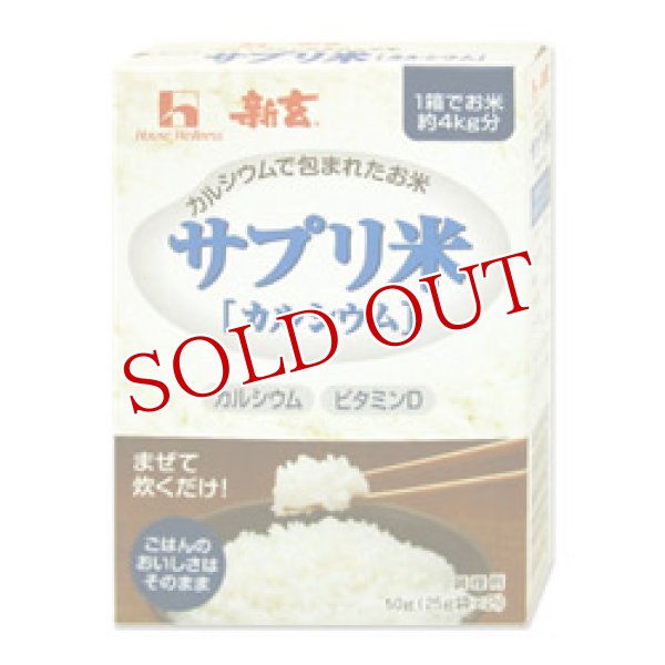 通常 3 営業日 〜 7 営業日程度で出荷予定 カルシウムで包まれたお米 ■ 食生活で不足しがちなカルシウムをまぜて炊くだけでしっかり補給お米にまぜて炊くだけで、「カルシウム」と「カルシウムの補給を助ける3つの成分(ビタミンD、CPP※、乳糖)」が補給できます。※CPP:カゼインホスホペプチド。牛乳やチーズが供給源で、カルシウムや鉄などのミネラルを溶けやすくして、吸収を高めるという働きがあります。 ■ ごはんのおいしさはそのまま炊き上がりの見た目、おいしさはいつものごはんと変わりません。 ■ 本品1箱(50g)でお米約4kg分にお使いいただけます商品名新玄 サプリ米[カルシウム]ブランド新玄品名カルシウム強化米内容量【50g(25g×2袋)】×2個商品コードJ4530503081160Sお召し上がり方(1)本品を洗米後のお米(または無洗米)1合に専用スプーン2杯(約2g)の割合で加えてください。(2)水加減をし、まぜ合わせ、炊飯してください。※ 本品を炊く前に加えていただく以外は、普段どおりに炊飯してください。※ 本品を洗米後のお米に、洗わずにそのまま加えてください。使用上の注意□ 着色料、保存料は使用しておりません。□ 保存中に色が変化する場合がありますが、栄養成分含量への影響はありません。□ 開封後は虫のつかないように注意し、お早めにお使いください。保存方法直射日光を避け、湿気の少ない涼しい場所に保管してください。原材料名精白もち米、卵殻粉末、デキストリン、でんぷん(小麦を含む)、乳糖、CPP(カゼインホスホペプチド(乳成分))、ミルクカルシウム、クエン酸、ビタミンD3栄養成分表示1箱(50g)当たりエネルギー:154kcal、たんぱく質:3.4g、脂質:0.5g、炭水化物:34.0g、ナトリウム:10〜31mg、カルシウム:2500mg、ビタミンD:5〜18μg本品をお米1合に専用スプーン2杯(約2g)加えた場合カルシウム:108mgメーカーハウスウェルネスフーズ株式会社(House Wellness)区分栄養補助食品