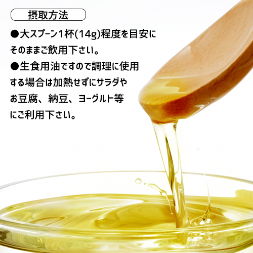 エネルギー 900kcal たんぱく質 0g 脂質 100g 炭水化物 0g ナトリウム 0mg オメガ3(リノレン酸) 21.9g オメガ6(リノール酸) 20.3g オメガ9(オレイン酸) 43.6g ビタミンE 34.5mg |